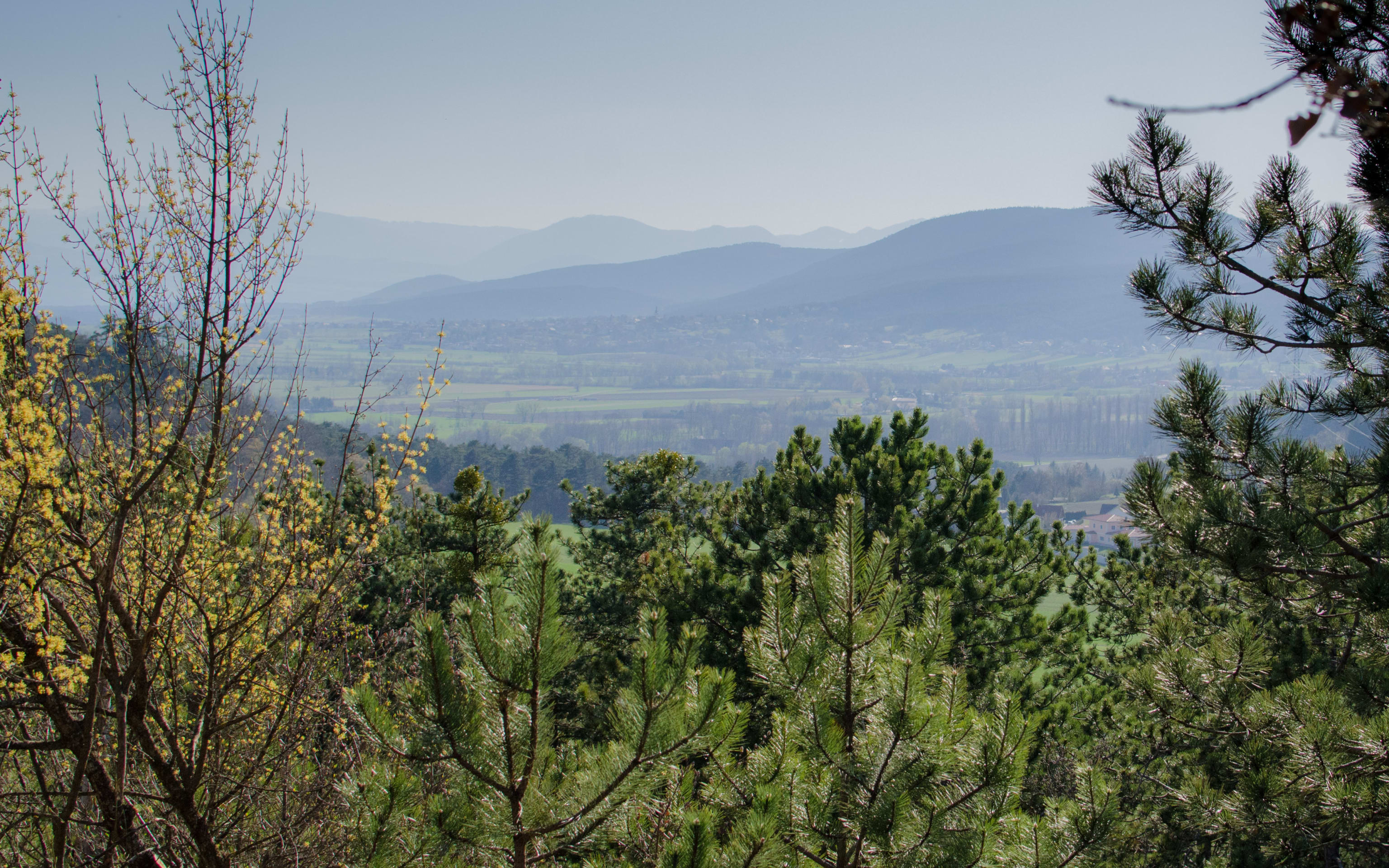 Trotzdem hab’ ich mich dann nach ein paar Wochen nach ein wenig Abwechslung gesehnt und so sind wir – nach tagelangen leeren Versprechungen – einmal raus aus dem Ort und in den Wald gegangen. Haben uns quasi auf Waldexpedition begeben, auf der Suche nach Besonderheiten und Sehenswertem. Die kleine Maus in der Kraxe, die Große an der Hand, im Rucksack eine gute Jause. 4 Kilometer sind wir (diesmal zu viert) marschiert, bis hinauf zum „Schönen Ausblick“. Dort haben wir ein kleines Waldpicknick gemacht und die Sonne genossen.