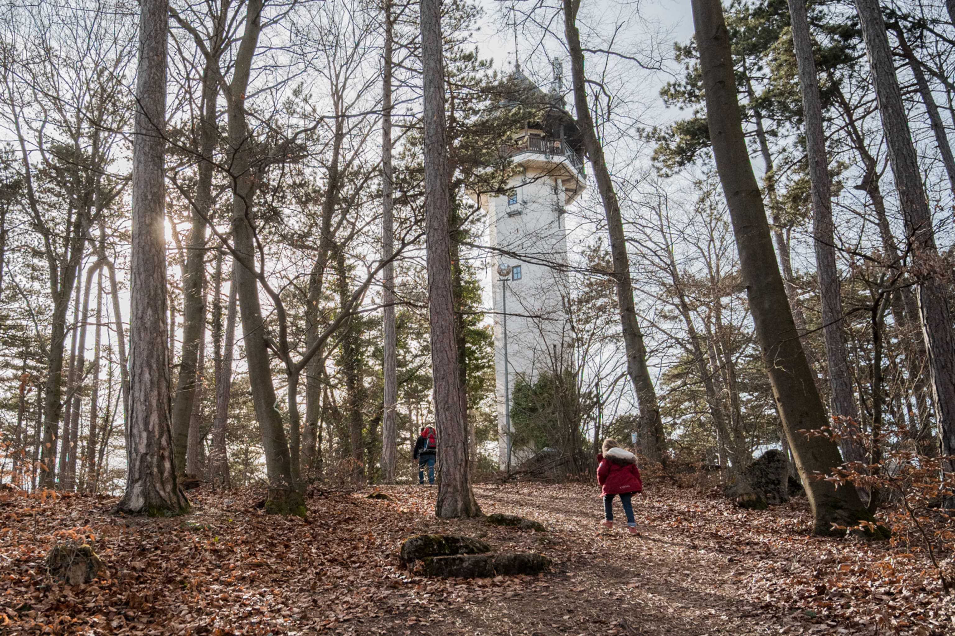Ein kleines Stück höher, auf 473m, liegt die einladende Hütte und die eindrucksvolle Jubiläumswarte. Schritt für Schritt rückt der weiße, 34 Meter hohe, Turm in unser Blickfeld und verspricht herrliche Aussichten über die Region. Die Aufregung bei unserer großen Madame wird jeden Meter größer, immerhin ist kein Aussichtsturm vor ihr sicher. Oben angelangt müssen wir aber enttäuscht feststellen, dass die Warte (coronabedingt) verschlossen ist.