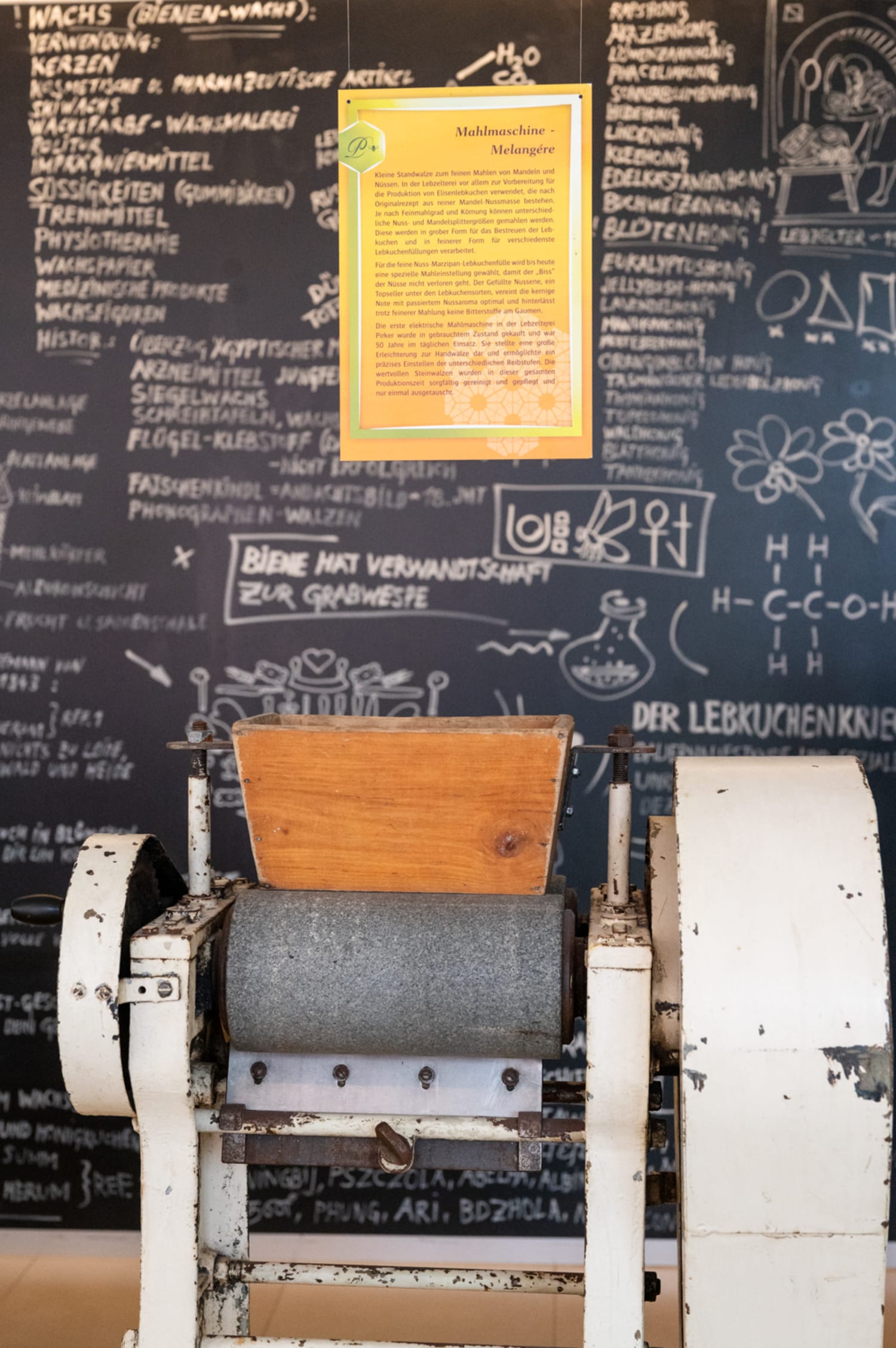 Später, sage ich mir nochmals und stecke den Lebkuchen in den Rucksack. Wir steigen die Treppen in den nächsten Stock hinab und beginnen unsere Besichtigungstour der insgesamt 3500m2 großen Besichtigungsfläche. Langsam erkunden wir die erste Ebene. Die vielen historischen Maschinen, die vor vielen Jahren für die Lebkuchenherstellung genutzt wurden gefallen mir dabei besonders, aber auch die richtig schöne Gestaltung des Ausstellungsraums. Eine riesige Tafel mit unzähligen Infos über Bienen, Honig und Lebkuchen (da der Bestandteil von Honig im Lebkuchen enorm groß ist, sind diese Dinge eben eng miteinander verbunden), dahinter ein großes, detailreiches Modell von Mariazell aus Lebkuchen (richtig cool). Dazwischen kleine Infostationen über die Lebkuchenproduktion. Unser aller Highlight: die Gewürze, die es zu erschnuppern und erraten gibt.