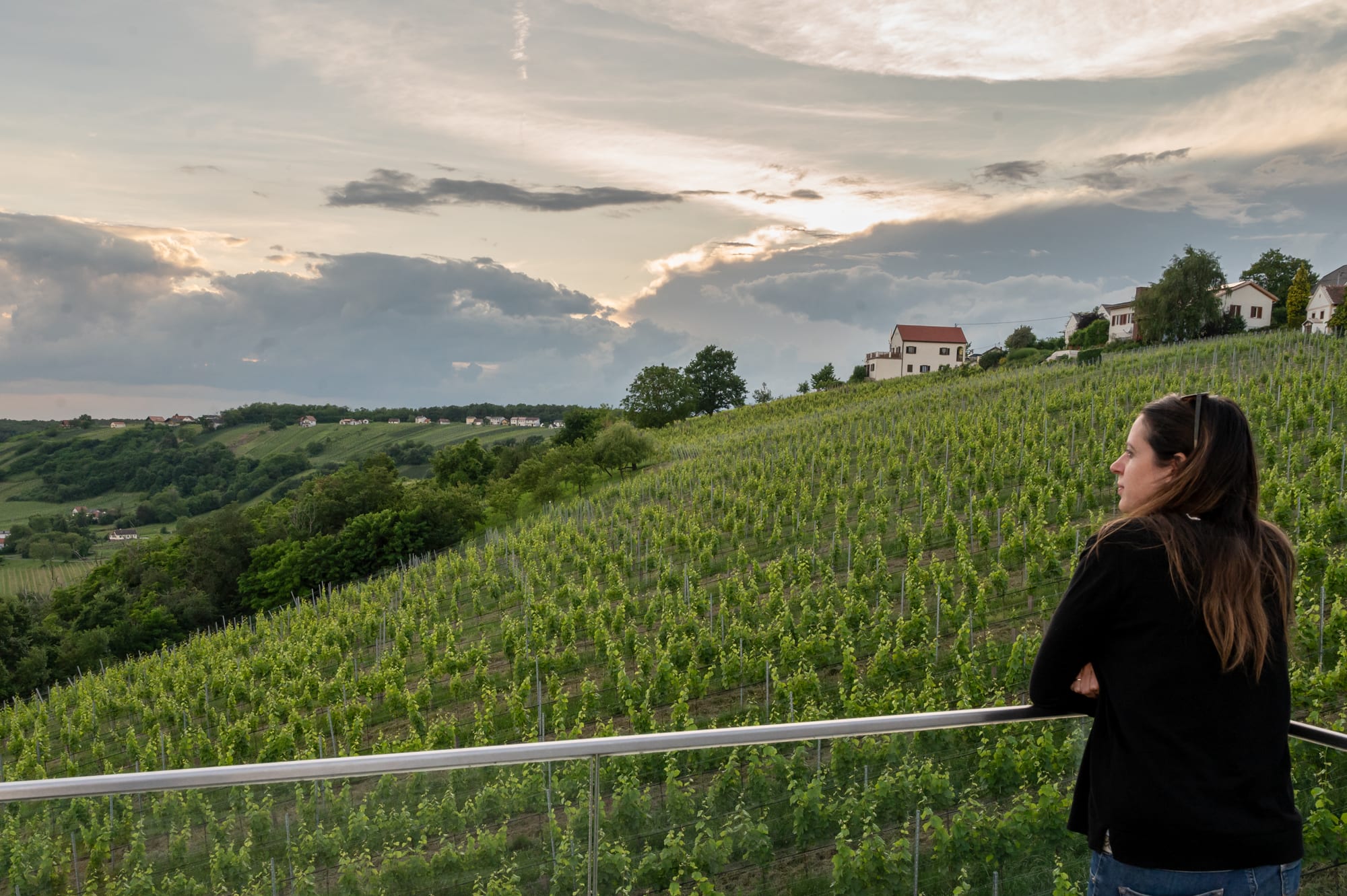 Den großen Hunger heben wir uns aber für den nächsten Heurigenbesuch auf. Das moderne Heurigenlokal des Weingut Poller punktet mit einer großen Speisekarte und schönen Terrasse mitten in den Weinbergen. Auch wenn die Sonne bald hinter Gewitterwolken verschwindet, genießen wir die Aussicht und besondere Stimmung zwischen den Weinreben.