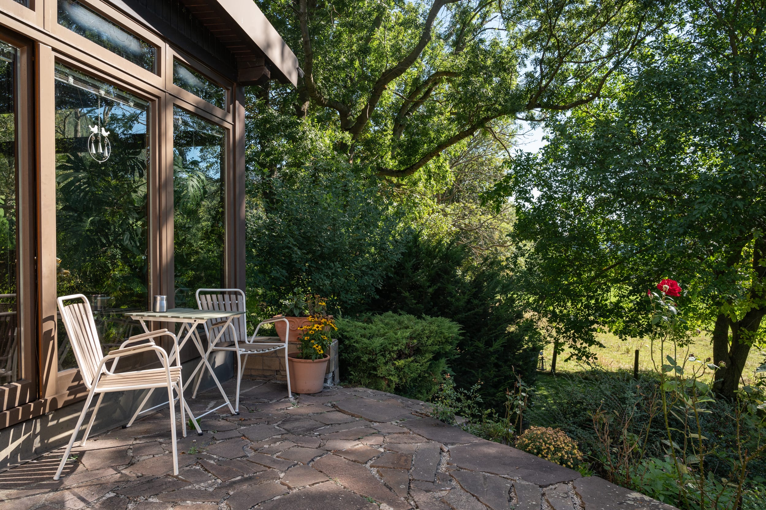 Unser großer Wintergarten mit Blick ins Grüne ist das Highlight für viele unserer Gäste. Ganzjährig nutzbar, bietet er neben gemütlichen Sitzgelegenheiten auch ausreichend Platz für Yoga, etc.