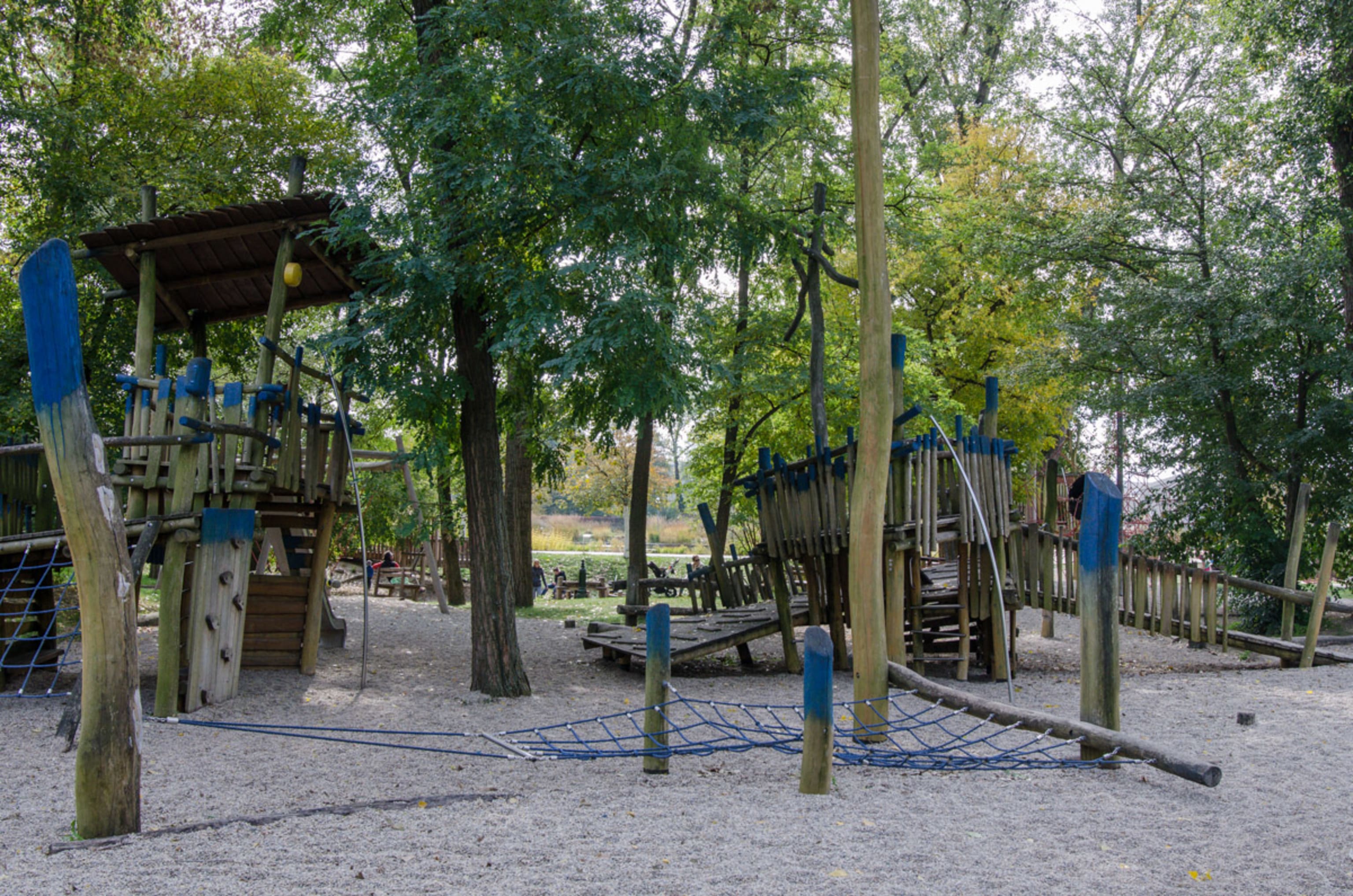 Große Schiffwracks aus Holz mit Steuerrad und Rutsche, Baumhäuser im Schatten hoher Bäume, kleine und größere Trampolins zum Hüpfen, eine gemütliche Netzschaukel, eine riesige Sandkiste und Attraktionen mit Wasser. Ein perfektes Spieleparadies für die Kleinen. Alles im Schatten der großen, alten Bäume. Dazu Hängematten für die erschöpften Eltern zum Rasten. So konnten wir hier den Ausflug perfekt ausklingen lassen. Die Müden Energie tanken, die wieder Gestärkten sich bei Rutsche, Klettern und Wasser Pritscheln wieder auspowern.