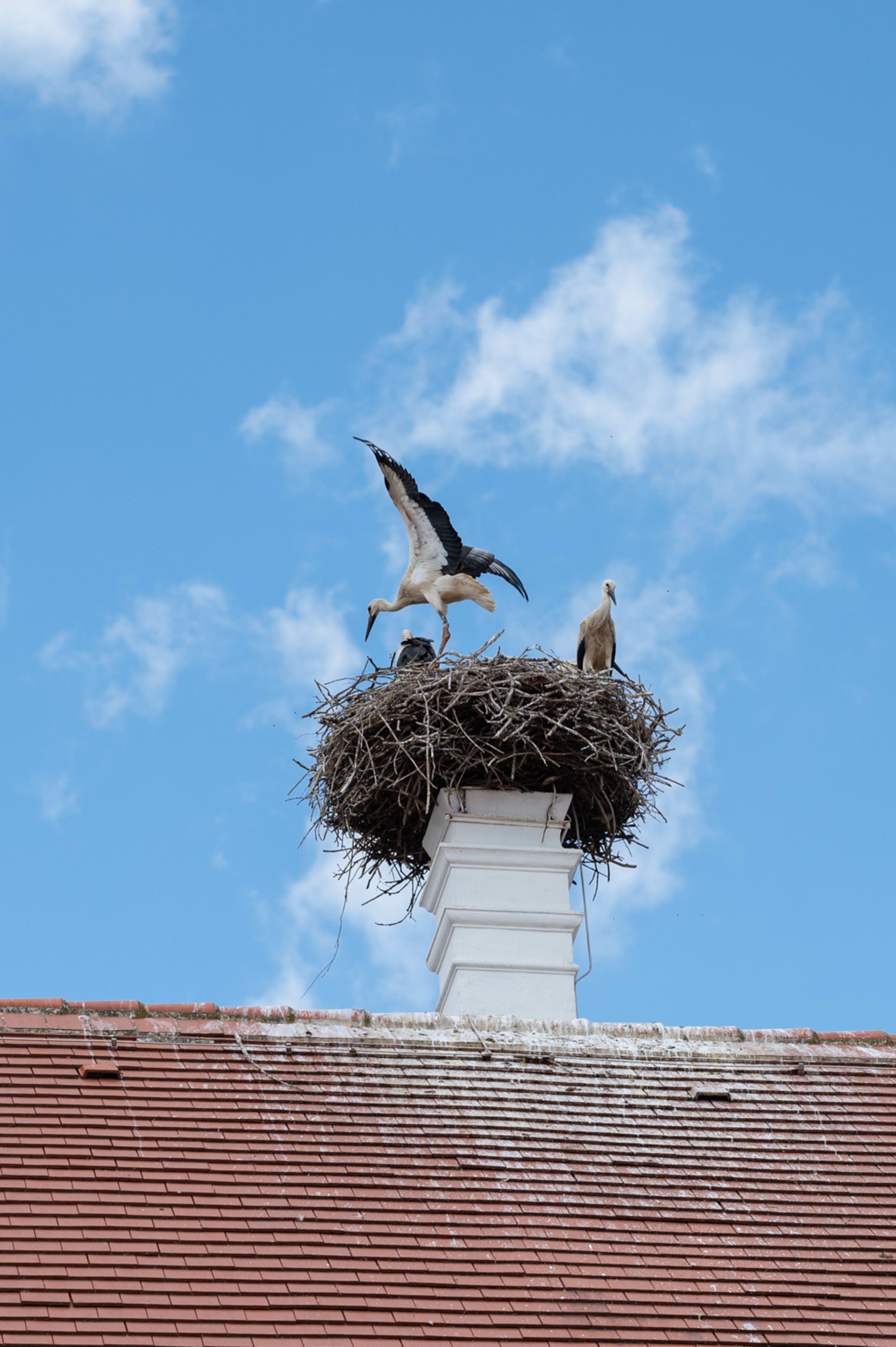 Weit kommen wir nicht, schon im Innenhof bleiben wir wieder stehen. Auf den Dächern ringsherum zählen wir mehr als fünf Storchennester, die allesamt gut besetzt sind. Begeistert beobachten wir die Vögel bei ihren ersten Flugversuchen, die für den Monat Juli ganz typisch sind. Immerhin gehört fleißig geübt, bevor die Störche Mitte August ihre Nester in Richtung Süden verlassen und ihre lange Reise antreten.