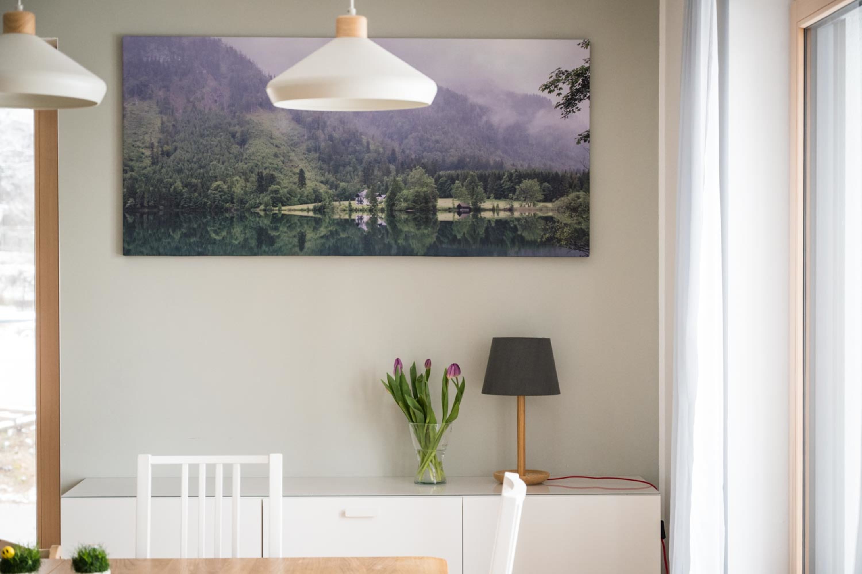 Erinnerungen an einen leicht verregneten aber stimmungsvollen Urlaubstag im Juni 2020. In einem Jahr, an dem wir eigentlich in Südschweden hätten sein sollen und im Salzkammergut gelandet sind. An einen Tag, an dem wir das erste Mal seit Monaten etwas Neues entdeckten und einen Schlechtwetterspaziergang um den vorderen Langbathsee machten. Der See, der üblicherweise gut besucht ist, „gehörte“ an diesem regnerischen Tag fast nur uns. Unsere Tochter wanderte mit ihrem pinken Heidi-Regenschirm durch die Natur und die Kleine hielt gemütlich in der Kraxe ein Schläfchen. Ein unvergesslicher Tag und überhaupt ein Platz in Österreich, der dank seiner Schönheit die Sehnsucht nach Reisen, Entdeckungen und Natur weckt. Kurz gesagt – DAS passende Bild für unser Zuhause.